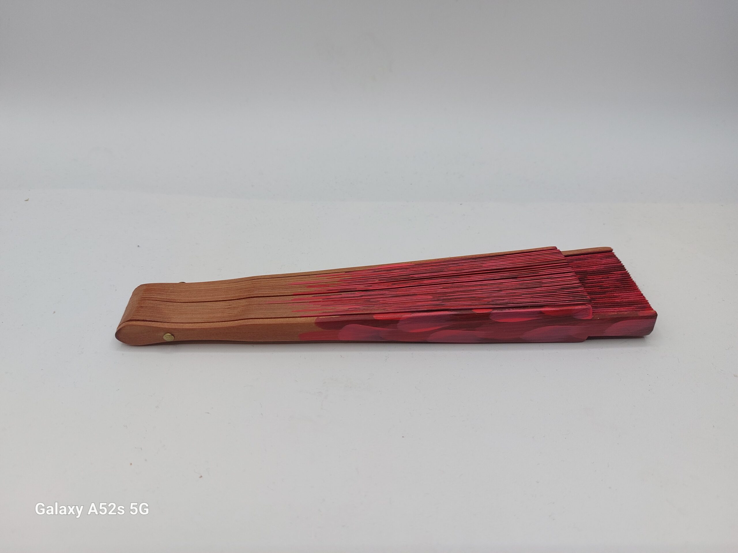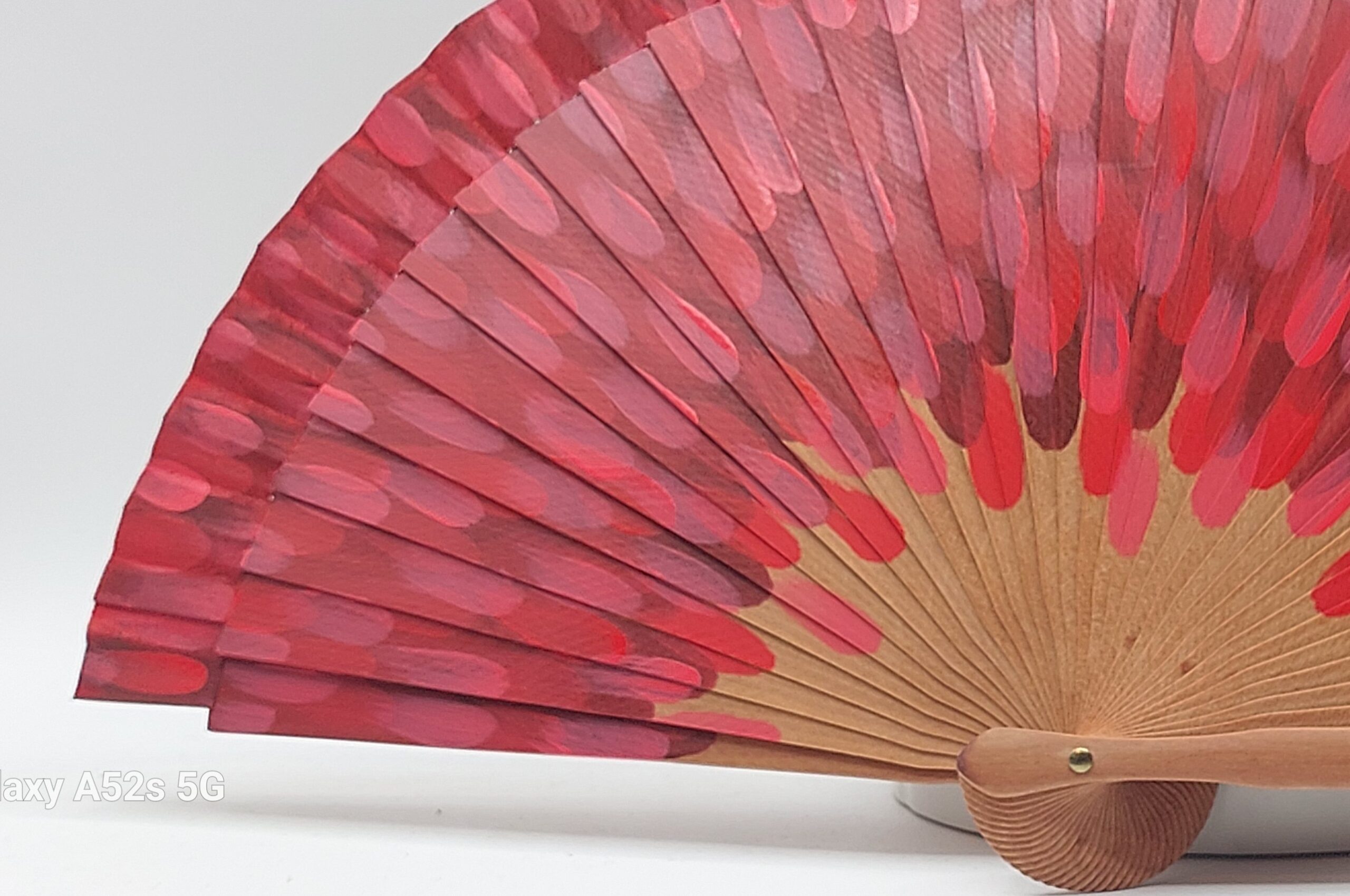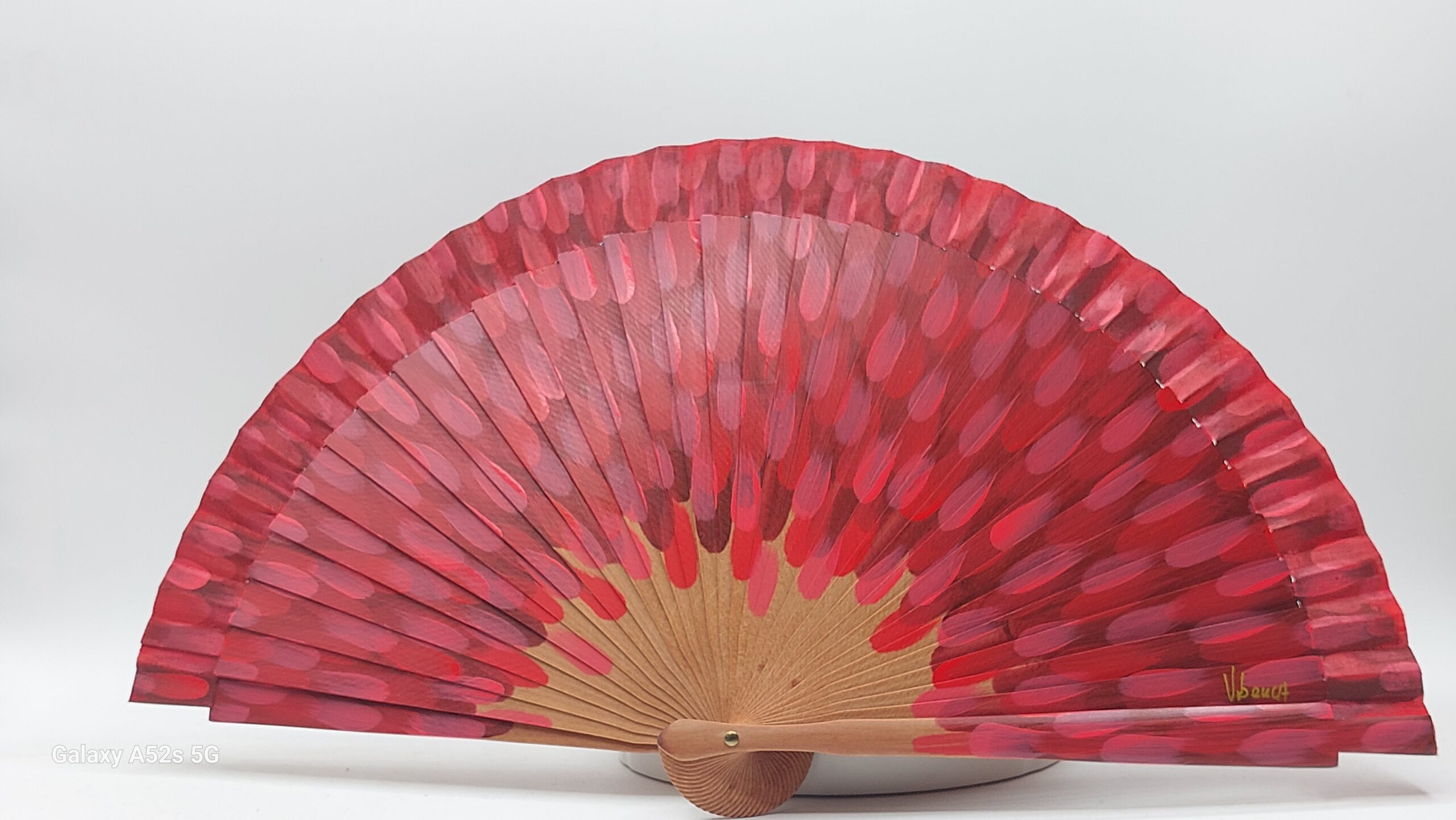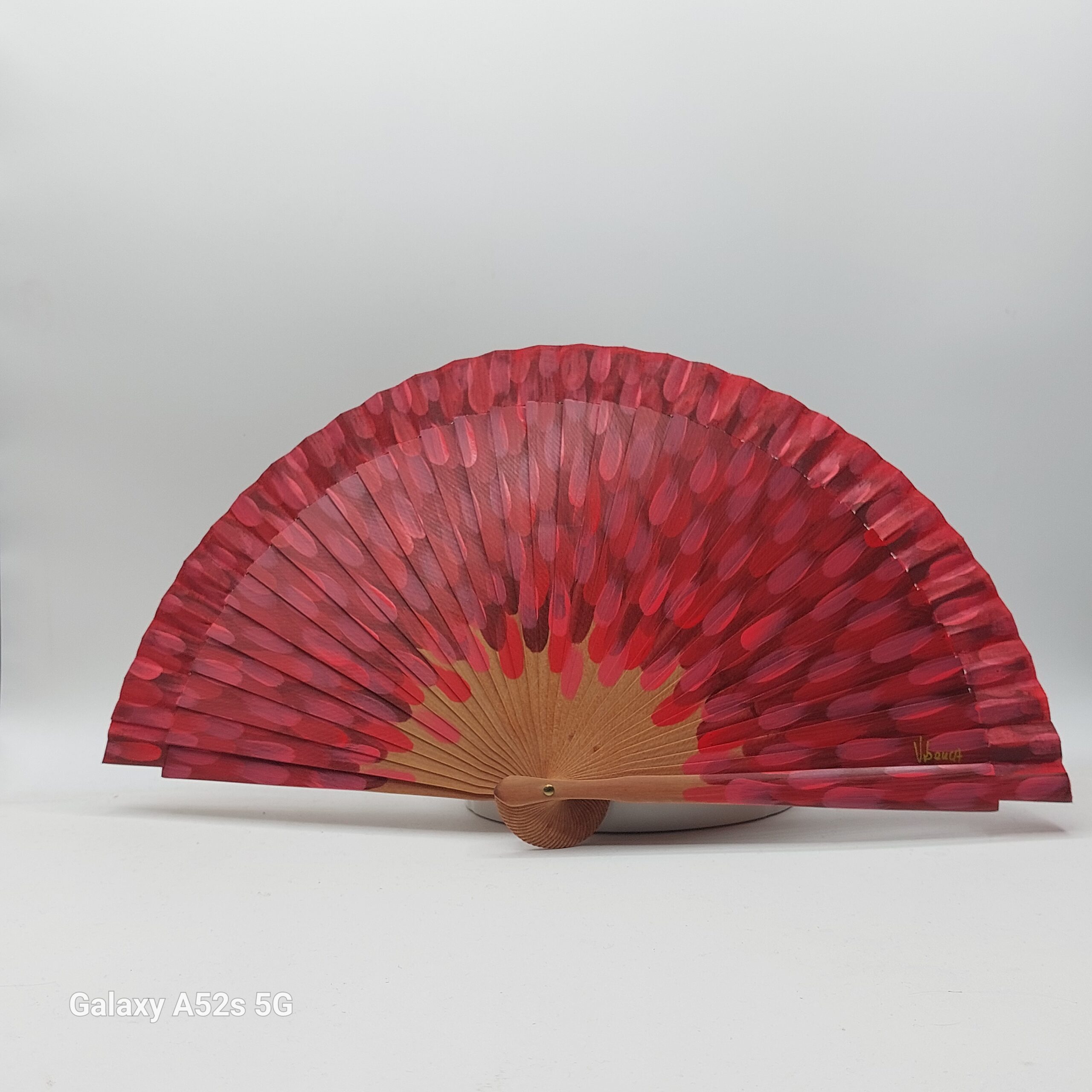 Un ventaglio che cattura l’essenza più vibrante della Spagna. Le pennellate rosse, intense e dinamiche, evocano il calore dei tramonti valenciani e la passione del flamenco.